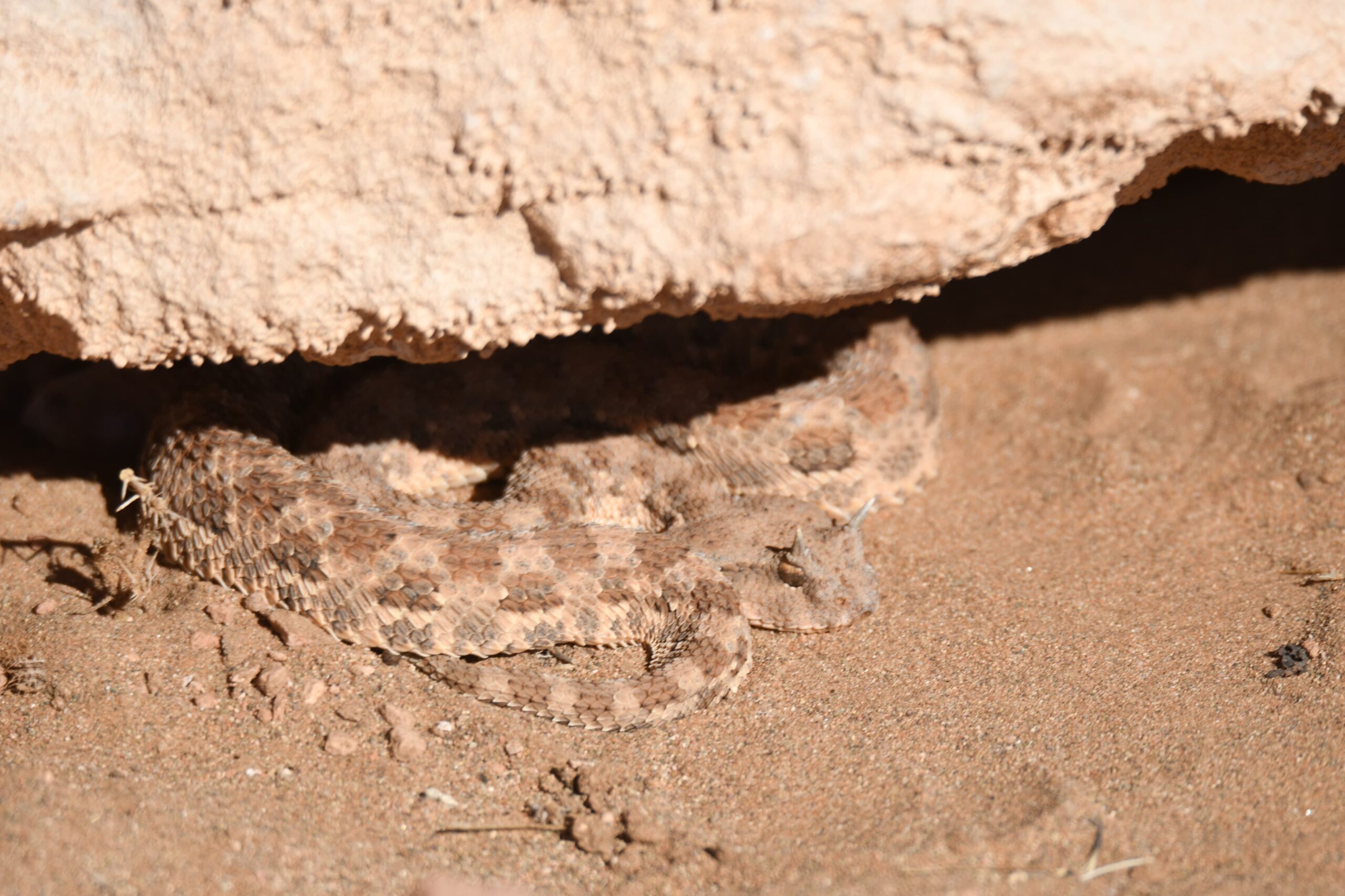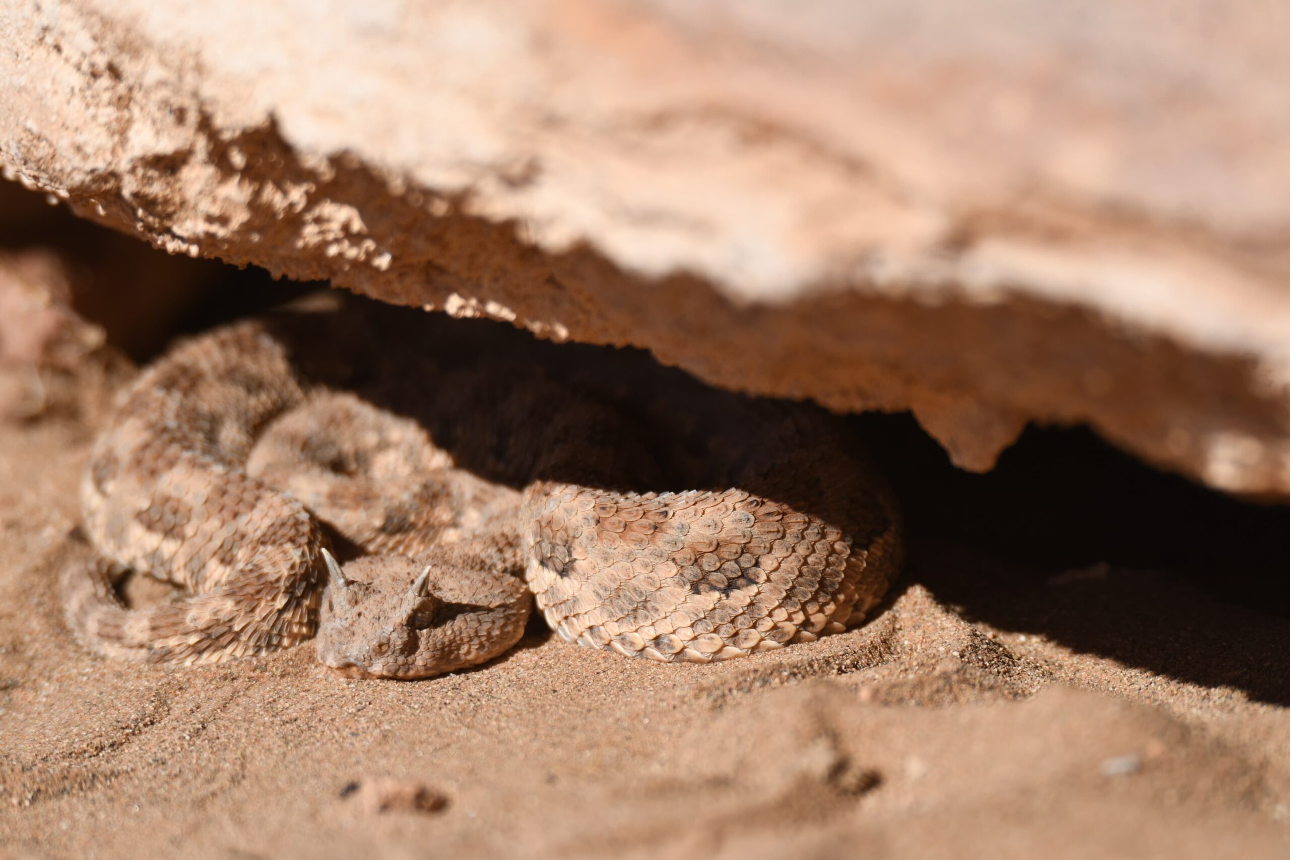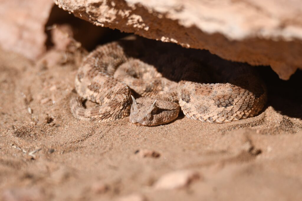 Encountering a Saharan horned viper in its natural habitat is a rare and fascinating experience for those exploring the vast desert landscapes of Morocco. Perfectly adapted to the harsh conditions of the Sahara, this elusive reptile is a true master of camouflage, often hidden beneath the sand with only its eyes and distinctive horns visible.
